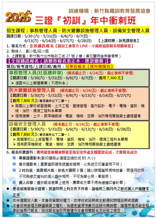 ‼️115年度5月份公寓大厦『三證班)』現正招生中‼️